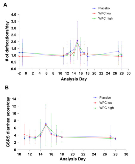 Response curves for stool frequency (mean # of defecations per day +/− SD) (A) and GSRS (mean domain score diarrhea per day +/− SD) (B) for the three treatment groups in the per protocol population. No statistically significant differences were found between placebo (circles, blue), WPC low (squares, red) and WPC high (triangles, green) using mixed model statistical analysis.