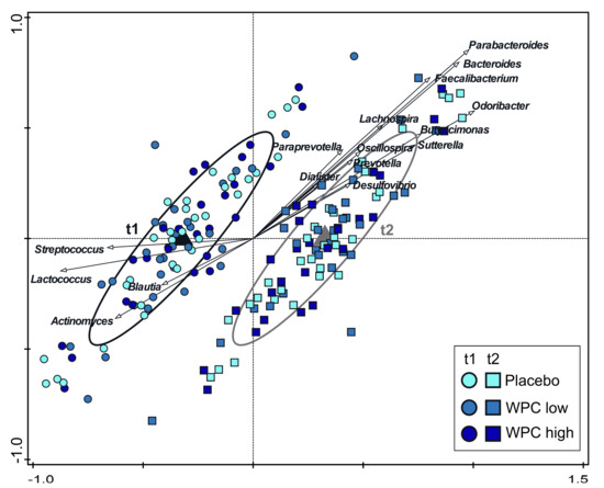 Exploratory analysis of microbiota composition was performed to test the hypothesis that a whey protein concentrate modulates the microbiota differently compared to the whey hydrolysate placebo. Microbiota composition at the start of the intervention was compared with microbiota obtained after 2 weeks (day 12/13 of the study) of consuming the intervention products but before the E. coli infection. In line with the primary outcomes, microbiota diversity (Faith’s phylogenetic diversity, Shannon index and Richness) was not different between the intervention groups at either time point. From baseline to day 12/13, Shannon diversity significantly increased (p = 0.0176) in the study population (combined treatment groups), but Faith’s phylogenetic diversity and Richness were not different (Supplementary Figure S1). Cross-sectional analysis by redundancy analysis (RDA) showed no difference between the microbiota composition of the WPC low, WPC high and placebo groups at d12/13 (variation explained by treatment was 0.1%, p = 0.36). However, time was a significant effect across all groups (variation explained by time point was 2.5%, p = 0.002), with a similar effect in all groups (Figure 3). Baseline (t1) was associated with higher relative abundances of, e.g., Streptococcus and Lactococcus, while d12/13 (t2) was associated with, e.g., Parabacteroides and Odoribacter. Bivariate analysis of all taxa across all groups between baseline and d12/13 showed, e.g., lower Streptococcus and Lactococcus (p = 0.0015 and p = 0.0009, respectively) and, e.g., higher Odoribacter and Bacteroides (p = 0.0005 and p = 0.0144, respectively) at d12/13 (Supplementary Table S2). However, RDA of change over time (ratios) confirmed that the microbiota change was not different between treatment groups (variation explained 0.4%, p = 0.21). Additionally, no association of microbiota composition with complaint scores was found (data not shown). In line with the lack of difference in microbiota composition between the intervention groups, there was also no observed difference in fecal SCFA composition (Supplementary Figure S2).