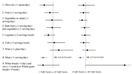 Performing additional multivariate analyses using each food score items instead of the Med-Diet adherence score, TxB2 (II vs. I tertile: OR = 0.45, p < 0.001, III vs. I tertile: OR = 0.57, p = 0.004) correlated with low meat consumption (meat < 1 serving/day) after correction for age > 65 years, sex, metabolic syndrome, antiplatelet therapy and APRI > 0.7 (Figure 1).