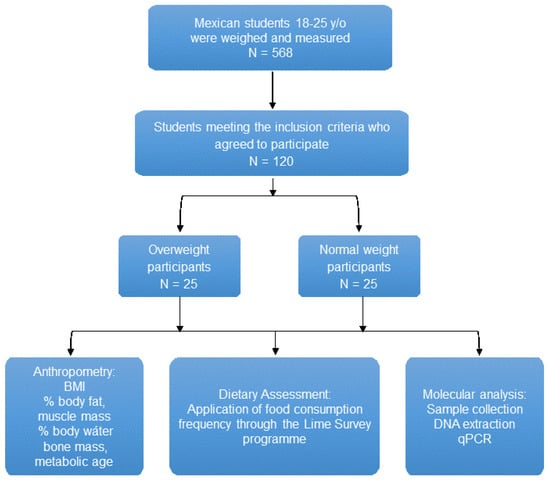 Subjects (females and males) aged between 18 and 25 years were selected in Ciudad Guzmán, a city located in Southern Mexico, from January to February 2014. Initially, 568 subjects were recruited in the first stage of the study, and then 50 subjects were divided according to anthropometric measures, such as body mass index (BMI) [21], into normal-weight and overweight/obese. The study was analytical, descriptive, and transversal. A schematic representation of this study is shown in Figure 1 This study was conducted in accordance with the Declaration of Helsinki and follows the rules of Law 14/2007 on Biomedical Research and the Organic Law 15/1999, RD 1720/2007 on the protection of personal data as well as international rules for research using samples from human beings. The participants’ accepted their inclusion in the study, signing the approved consent protocol. The confidentiality of the data obtained and any personal data used in this study has been kept and respected.