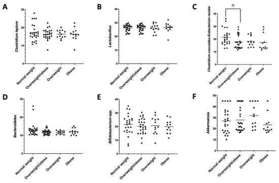 Microbial differences by qPCR. (A) Clostridium leptum, (B) Lactobacillus spp., (C) Clostridium coccoides-Eubacterium rectale, (D) Bacteroidetes, (E) Bifidobacterium spp., and (F) Akkermansia muciniphila. * p < 0.05, normal-weight vs. overweight/obese subjects.