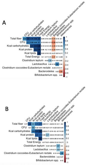 In the overweight/obese participants, fiber intake, and CFU do not correlate with the microbial variables, while Kcal from protein and Clostridium leptum was correlated positively with Lactobacillus. In the same way, Clostridium coccoides-Eubacterium rectale correlated with Akkermansia muciniphila. In the normal-weight participants, Clostridium leptum and Lactobacillus were correlated positively with Clostridium coccoides-Eubacterium rectale and Bifidobacterium, respectively, and Bacteroidetes was correlated negatively with Akkermansia muciniphila. In patients with type 2 diabetes, A. muciniphila was negatively associated with hemoglobin A1c [55]; its relative abundance is negatively associated with body mass [32,56,57,58].