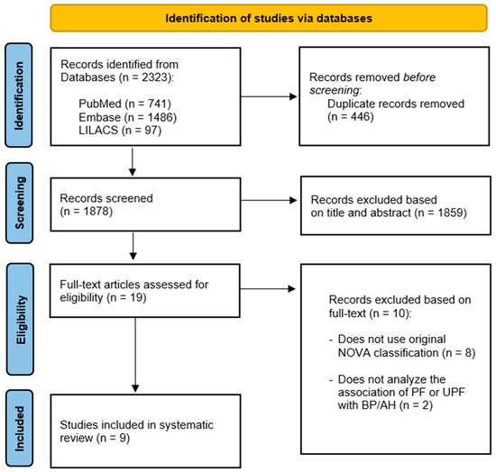 Studies that satisfied the criteria established using the PICOS method and evaluated the consumption of PFs and/or UPFs and its association with AH in adults and/or older people were included. No restrictions were imposed with regards to language or year of publication. Studies with pregnant women, children and adolescents, those that addressed a disease other than AH, review articles, guidelines, letters and editorials were excluded. Studies that used the terms “processed” or “ultra-processed” but did not follow the requirements of the NOVA classification proposed by Monteiro et al. (2010) [5] were not included.