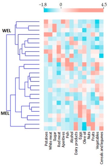 Two dietary patterns were identified as a result of the k-means cluster statistical analysis: the Mediterranean-like pattern (MEL) and the Western-like pattern (WEL). Figure 1 shows the resulting heatmap of the z-score variables for the 14 food groups.