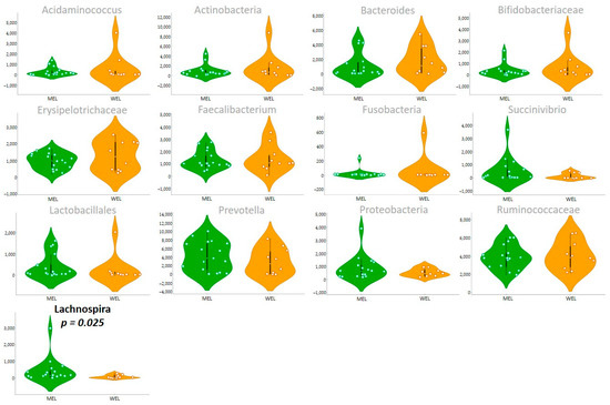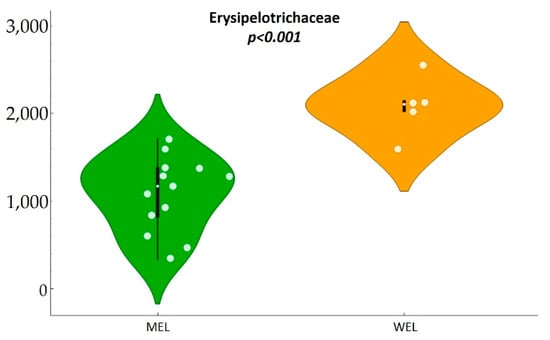 Additionally, significant differences were observed in the levels of Erysipelotrichaceae (p-value = <0.001) in MSM participants with MEL pattern versus MSM participants with WEL pattern, being more abundant in the latter, accounting for an approximate two-fold increase (Figure 7 and Table A7).