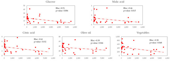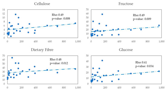 We explored the possible correlation of Lachnospira and Bacteroides with nutrients and foods in (Figure 4 and Figure 5). We observed a positive correlation between Lachnospira and cellulose (Rho = 0.49 and p-value = 0.008), fructose (Rho = 0.49 and p-value = 0.009), dietary fibre (Rho = 0.48 and p-value = 0.012), and glucose (Rho = 0.41 and p-value = 0.034). We observed a negative correlation between Bacteroides and glucose (Rho = −0.51 and p-value = 0.006), malic acid (Rho = −0,46 and p-value = 0.015), citric acid (Rho = −0.41 and p-value = 0.032), olive oil (Rho = −0.39 and p-value = 0.044) and vegetables (Rho = −0.38 and p-value = 0.048).