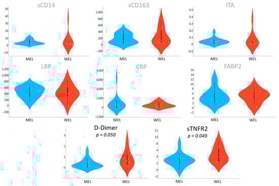 To further investigate the potential role of the diet on systemic makers of clinical progression, we analysed the associations between the dietary pattern and inflammatory biomarkers. We found that participants with a MEL pattern, exhibited reduced D-dimer (p-value = 0.050) and sTNFR2 (p-value = 0.049) levels compared to those with a WEL pattern (Figure 6 and Table A6).