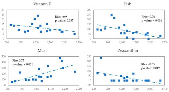 We explored in the whole MSM the possible correlation of Erysipelotrichaceae with nutrients and foods in (Figure 8). We observed a negative correlation with vitamin E (Rho = −0.9 and p-value = 0.037), fish (Rho = −0.76 and p-value < 0.001), zeaxanthin (Rho = −0.55 and p-value = 0.019), and a positive correlation with meat (Rho = 0.75 and p-value < 0.001).