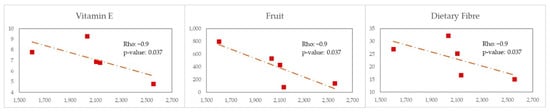 In contrast, in MSM with WEL pattern (Figure 10) we observed a negative correlation with vitamin E (Rho = −0.9 and p-value = 0.037), fruit (Rho = −0.9 and p-value = 0.037) and dietary Fibre (Rho = −0.9 and p-value = 0.037).
