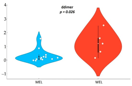 Analysing the data by risk group, we observed that in MSM participants with MEL pattern, there were s differences in D-dimer (p-value = 0.026) with mean levels almost half of those found in participants with WEL pattern (Figure 11 and Table A8).
