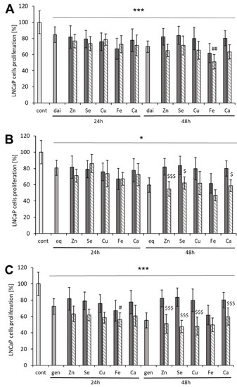 In this study, we examined the combined effects of selected essential elements (Zn, Se, Cu, Fe and Ca) and major dietary isoflavones—genistein, daidzein and its gut microbiota metabolite equol on hormone-dependent LNCaP prostate cancer cells and potency of model mutagens. The chosen concentrations of minerals were within the physiological range observed in human serum [12,15] and tissues [16,17]. Used concentrations of isoflavonoids corresponded to the maximal levels observed in prostatic tissue after soy isoflavones oral supplementation in doses achievable with high consumption of soy products [45].