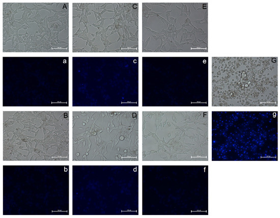 We evaluated the effect of the most active isoflavone and mineral in the proliferation test, i.e., genistein and Fe, on the viability and apoptosis of LNCaP cells. The action of Se was also assessed based on significant associations of selenium levels and prostate cancer occurrence. As shown in Figure 2, genistein, Fe or Se used individually did not induce apoptosis in LNCaP cells. Neither the spindle shape nor the morphology of the cells were changed (Figure 2B,C,E) in comparison to control cells (Figure 2A). We did not observe increased amount of cells with condensed chromatin or apoptotic nuclei which was dyed bright blue with Hoechst stain in cells as seen for positive control—the camptothecin-treated cells (Figure 2g). Similarly, no such changes were observed in cells treated with a mixture of genistein and Fe (Figure 2F,f). However, some less adhered, rounded cells (Figure 2D) without marks of apoptosis (Figure 2d) were observed after treatment with combination of Se and genistein. Cells treated with genistein, minerals (Se, Fe) or their combinations show lightly dyed nuclei with uncondensed chromatin.