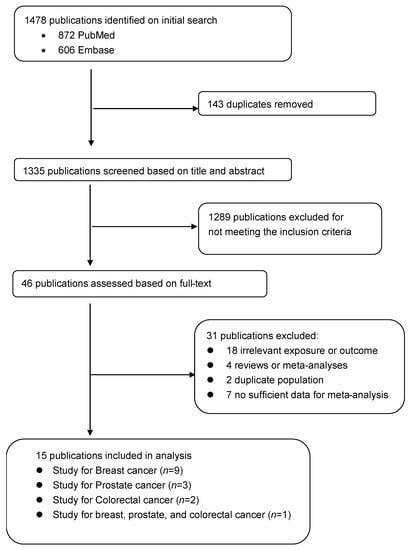 To be included, studies had to be an observational study (e.g., case-control study, cohort study) that examined the relationship between adolescent dairy intake (i.e., exposure) and cancer risk later in life (i.e., outcome), with the results reported as relative risks (RR) (odds ratio, rate ratio, hazard ratio) and at a 95% confidence interval (CI). We excluded abstracts, unpublished results, and review articles. When there were multiple publications from the same cohort [11,21,22,29], we chose the most recent article [21,22]. To identify additional papers, the reference lists of selected articles and previous systematic reviews were reviewed. After a series of screening, a total of 15 studies (9 studies for breast cancer, 3 studies for prostate cancer, 2 studies for colorectal cancer, 1 study for breast, prostate, and colorectal cancer) were eligible for this meta-analysis [2,13,14,15,16,18,19,20,21,22,23,24,25,26,27]. This study selection process is summarized in Figure 1. The characteristic of studies included are presented in Supplementary Table S3.