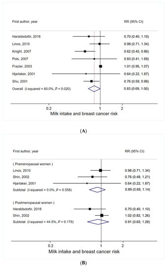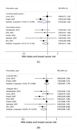 The following information was extracted from each article: name of the first author, publication year, study design, type (milk, dairy), fat content (low-fat, regular), and life stage (in age) of dairy intake; type and subtype (e.g., by stage) of cancer, relative risk and corresponding 95% CI, important characteristics of the study population (e.g., country, age, sex), and variables which were adjusted for.