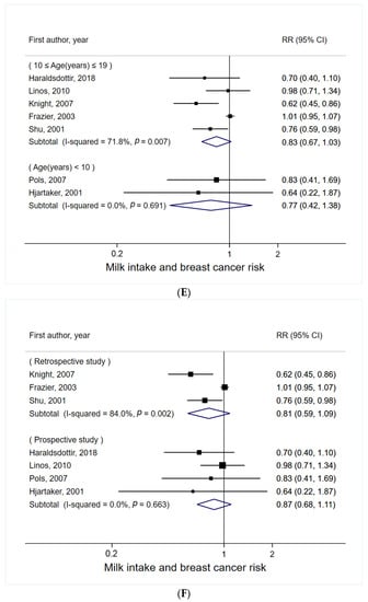 When heterogeneity was explored, there was no evidence of a significant relationship between early life milk intake and breast cancer risk, regardless of menopausal status (Figure 2B), cancer stage (Figure 2C), fat content of milk (Figure 2D), life stage of milk intake (Figure 2E), and study design (Figure 2F).
