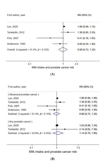 A total of four studies were included in this meta-analysis [2,13,14,15]. The summary RR of prostate cancer for the highest vs. lowest milk intake in childhood and adolescence was 0.98 (95% CI = 0.72–1.32), with moderate heterogeneity (I2 = 51%) (Figure 3A). There was no evidence of small study effects such as publication bias (PEgger = 0.52).