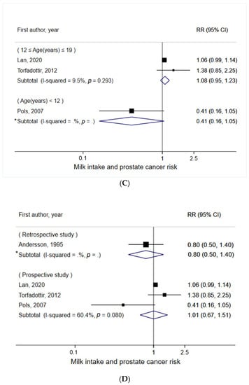 Meta-analysis of milk intake in early life (A) with any prostate cancer risk, (B) by cancer stage, (C) by life stage of milk intake, and (D) by study design. For each study, the RR and corresponding 95% CI of individual studies are marked by the location of the black box and the width of the horizontal line, respectively. The size of the box indicates the weight that the RR receives when calculating the summary estimate. The summary RR and its 95% CI are represented by the center and weight of the diamond, respectively. * I2 and p value are not defined when there is only one study in the meta-analysis.