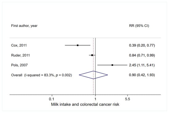 A total of three studies were included in this meta-analysis [2,16,18]. The summary RR of colorectal cancer for highest vs. lowest milk intake in childhood and adolescence was 0.90 (95% CI = 0.42–1.93), with high heterogeneity (I2 = 83%) (Figure 4). Small study effects, such as publication bias, were not indicated by Egger’s test (PEgger = 0.93). In sensitivity analysis based on early life dairy intake, no significant association was observed (summary RR = 1.07, 95% CI = 0.59–1.94, I2 = 77%) (Supplementary Table S6).