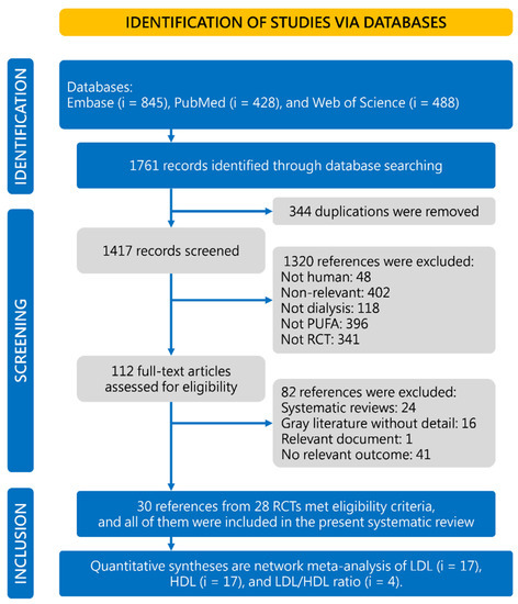 - Wu, P.-K.; Yeh, S.-C.; Li, S.-J.; Kang, Y.-N. Efficacy of Polyunsaturated Fatty Acids on Inflammatory Markers in Patients Undergoing Dialysis: A Systematic Review with Network Meta-Analysis of Randomized Clinical Trials. Int. J. Mol. Sci. 2019, 20, 3645. [Google Scholar] [CrossRef]