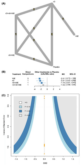 | 0.16 (−1.17; 1.49) | 0.20 (−0.74; 1.14) | −1.31 (−2.58; −0.04) | 0.07 (−1.34; 1.48) | n-3 + VitE | |||