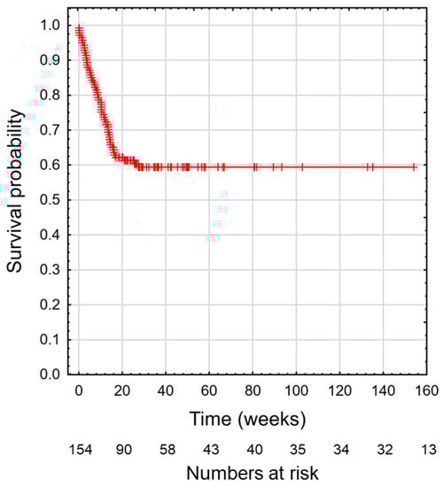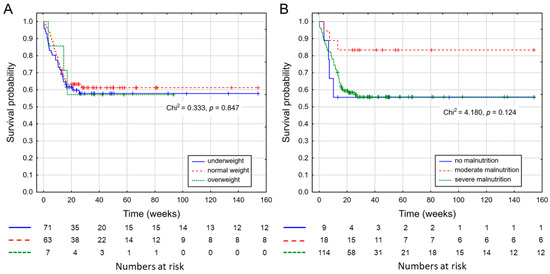 The overall survival curve for 157 patients who were qualified for home enteral nutrition is shown in Figure 1. The mean patient survival was 44.7 weeks and the median was 23.9 weeks. Figure 2 shows the survival curve depending on BMI and GLIM classification at qualification visit. The survival time in all figures is presented in weeks.