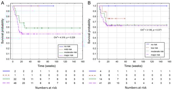 As NRI and GNRI are age-dependent indicators of malnutrition risk, the analyzed group was as follows: NRI, patients below 65 years old (n = 83); GNRI, patients ≥65 years old (n = 74). The results for NRI and GNRI are shown in Figure 3.