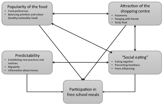 The accessibility to a nearby shopping center led to a competition with the free school lunch. These results seem consistent with a study from Finland which found that the availability of grocery stores or fast-food restaurants near schools was associated with higher fast-food purchases [43]. The short distance to these establishments was reversely associated with skipping breakfast and the free school lunch, especially for low-SES adolescents [43]. A rapid evidence review about school food provision in high-income countries identified that many barriers to participation were explicitly related to the school environment and neighborhoods rather than the school meal programs, such as access to competitive foods [58]. As other studies have shown [42,67], going to the mall or fast-food restaurants is part of adolescents’ increasing autonomy. In addition, independently seeking out foods and controlling their own food choices were important issues [42] found related to adolescents’ eating autonomy.