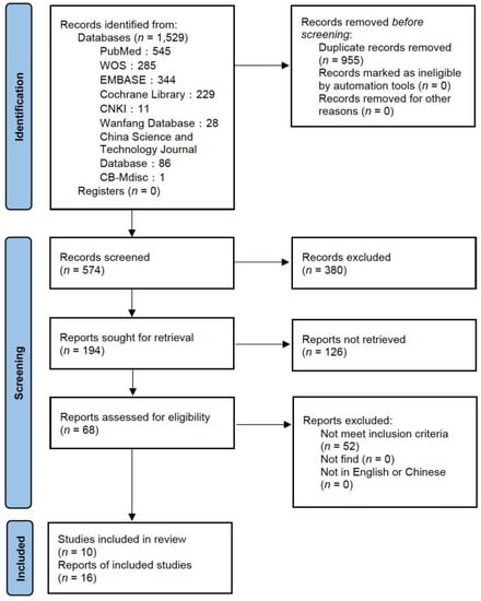 This meta-analysis of RCTs included 182,788 individuals in 16 papers with a broad range of baseline characteristics. A flow diagram is presented in Figure 1. The literature search in eight databases yielded 1529 publications in total. After removing the duplicates, 955 publications were excluded. There were 380 publications excluded due to irrelevant titles, and 126 publications were excluded after reviewing the abstracts. A total of 68 publications were retrieved and examined in full text. There were 52 publications which did not meet the inclusion criteria and were excluded. Finally, 16 publications reported on 10 unique studies were included in this systematic review, and the number of participants in the studies ranged from 366 to 39,876.