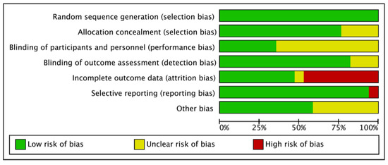 In the 16 included articles, all of them indicated a low risk of selection bias for random-sequence generation. In total, 65–90% of them indicated a low risk of for allocation concealment (selection bias), blinding of outcome assessments (detection bias), selective reporting (reporting bias), and other bias. About half of the studies indicated a low risk of attrition bias for incomplete outcome data, while 45% of the studies showed a high risk for indicating losses to follow-up or treatment withdrawals. In addition, there were 65% of included articles that indicated an unknown risk of bias for blinding of participants and personnel, where the blinding status of them was not explicitly reported in the studies. The risk of bias is presented in Figure 2.