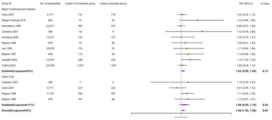 Major CVD includes myocardial infarction, stroke, peripheral arterial disease, ischemic CVD, and revascularization procedure. The results indicated no effect of β-carotene supplementation on major cardiovascular incidence when compared with placebo (RR: 1.03; 95% CI: 0.99, 1.08; p = 0.13; I2 = 0%). Other CVD includes angina pectoris, transient ischemic attack, and critical limb ischemia. No effects were observed in other CVD either (RR: 1.06; 95% CI: 0.95, 1.18; p = 0.29; I2 = 11%). However, overall, we observed a positive association between β-carotene supplementation and risk of CVD (RR: 1.04; 95% CI: 1.00, 1.08; p = 0.05; I2 = 0%). The results are shown in Figure 3.