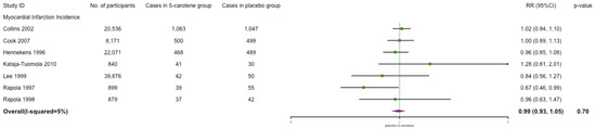 We categorized the cases of major coronary event and coronary heart disease into myocardial infarction. Similarly, no significant association between β-carotene and myocardial infarction incidence was observed (RR: 0.99; 95% CI: 0.93, 1.05; p = 0.70; I2 = 5%) (see Figure 4).