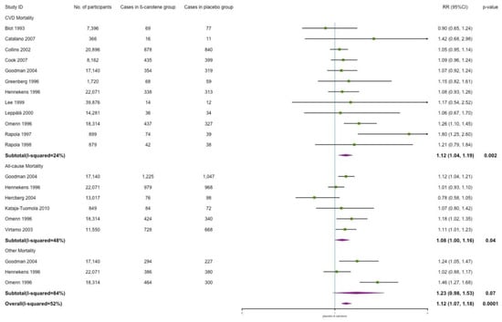 β-carotene supplementation was associated with a significant increased risk of cardiovascular mortality (RR: 1.12; 95% CI: 1.04, 1.19; p = 0.002; I2 = 24%, Figure 6). Besides cardiovascular death, other causes included lung cancer, other cancer, malignant neoplasm, respiratory diseases, and the unknown. The results showed that, compared with placebo, the effect of β-carotene indicated a risk increment for all-cause mortality with low to moderate heterogeneity (RR: 1.08; 95% CI: 1.00, 1.16; p = 0.04; I2 = 48%, Figure 6). However, no effect was observed in other-cause mortality (RR: 1.23; 95% CI: 0.98, 1.53; p = 0.07; I2 = 84%, Figure 6). After removing the study (Hennekens 1996) focused on healthy individuals only, a significant risk increment was observed in the smoking population (RR: 1.36; 95% CI: 1.16, 1.59; p = 0.0001; I2 = 50%, Figure A2). In sum, a potential harmful effect of β-carotene was observed in overall mortality.