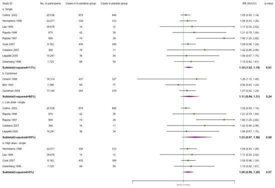 In Figure 8, the effects of the different β-carotene treatment regimens on cardiovascular mortality are shown. We noted that the effect of single β-carotene supplementation on cardiovascular mortality showed a risk increment as well (RR: 1.10; 95% CI: 1.02, 1.19; p = 0.01; I2 = 11%). No effect was observed in the combined treatment group. In addition, different dosages did not have an impact on cardiovascular mortality either.