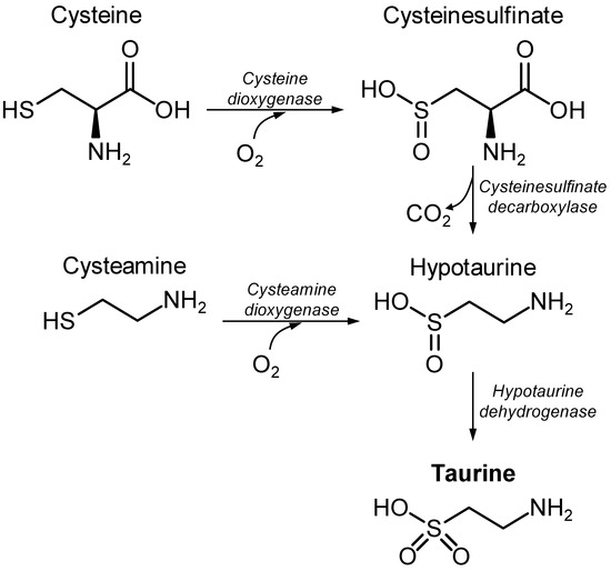Taurine, or 2-aminoethanesulfonic acid, was first isolated from ox bile in 1827, by Friedrich Tiedemann and Leopold Gmelin. Taurine is obtained from the diet or results from de novo synthesis through catabolism of the amino acid cysteine (Figure 1). Together with glycine, taurine is well known for bile acid amidation, producing bile salts for excretion. Taurine supplementation has been suggested to have beneficial effects on a number of disorders, for example, hypertension [1,2], congestive heart failure [3], ischemia–reperfusion myocardial injury [4], intracerebral hemorrhage [5], pulmonary fibrosis [6], obesity-induced low-grade inflammation [7]. The neuroprotective effects of taurine have received considerable attention, and there is a plethora of publications showing the ability of exogenously added taurine to prevent toxicity in neurons or astrocytes in vitro, as well as in animal models of neurological disorders (reviewed by Jakaria et al. [8]). Namely, taurine treatments have been shown to protect tissues and cells against oxidative stress (e.g., [9]), mitochondrial stress (e.g., [10]), or inflammation (e.g., [11]). In addition, brain taurine is known as an osmoregulator and neuromodulator [12,13] and is involved in numerous processes, such as the modulation of neuronal excitability, the cerebral control of the cardiorespiratory system, appetite regulation, resistance to hypoxia, osmoregulation, and anti-oxidation [14]. Enzymes that synthetize taurine show low activity in cats, dogs, and foxes, which develop pathologies when fed a taurine-deficient diet, namely, cardiomyopathy and myocardial dysfunction, retinal degeneration, neurological abnormalities, weakened immune response, pregnancy and fetal development complications, as well as gastrointestinal problems (see [15] and references therein). This is clear evidence advocating for the importance of taurine.