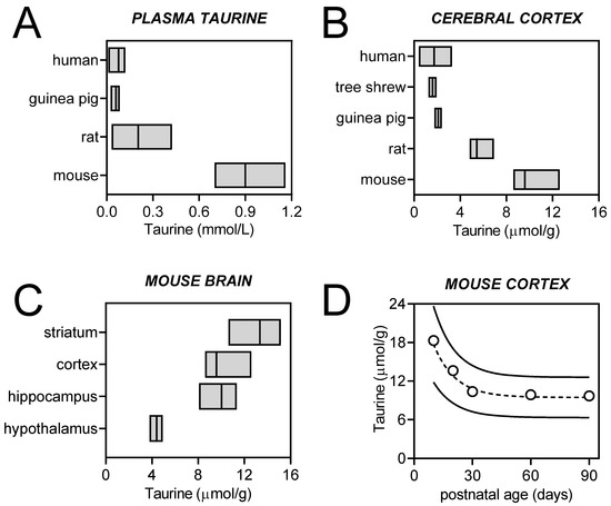 Concentrations of taurine in the plasma (A) and cerebral cortex of various species (B), in different areas of the mouse brain (C), and in the mouse cortex during development (D). Plasma taurine levels are indicated as mean and range for humans [2,20,21,22,23,24,25,26,27], guinea pigs [28,29], rat [30,31,32,33,34,35,36], and mice [37,38,39,40,41]. The plotted brain taurine concentration ranges are based on the concentrations reported in 1H MRS studies for humans [42,43,44,45,46,47], tree shrews [48], guinea pigs [49], Sprague–Dawley rats [50,51,52,53,54,55], and C57BL/6J mice [38,56,57,58,59,60].