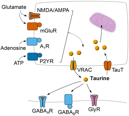 Schematic representation of activity-dependent taurine release modulation from neurons or astrocytes by glutamate and purines and action of taurine on inhibitory receptors. Taurine release is mainly mediated by volume-regulated anion channels (VRAC) that are activated by hypo-osmotic conditions and electrical activity and can be stimulated via glutamate metabotropic (mGluR) and ionotropic receptors (mainly NMDA and AMPA), adenosine A1 receptors (A1R), and metabotropic ATP receptors (P2Y). Taurine mediates its neuromodulatory effects by binding to GABAA, GABAB, and glycine receptors. Reuptake of taurine occurs vis the taurine transporter TauT.