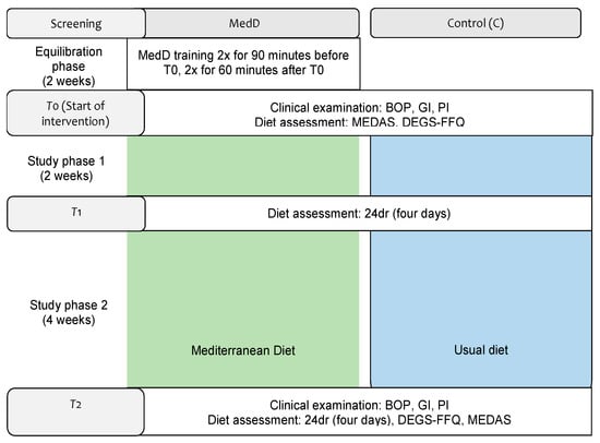 Aiming to harmonize the clinical conditions before the start of the intervention, all participants continued their usual diet for the first 2 weeks. Furthermore, at-home dental care was equalized by asking all participants to refrain from using interdental cleaning tools and mouthwashes [,]. During the subsequent 6 weeks, the MedDG changed their diet to conform to a MedD. They also participated in four nutrition classes in groups of up to five participants: two sessions before starting the MedD and two meetings during the intervention period (Figure 1). Further information can be found in [].