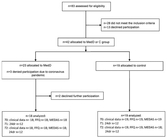 CONSORT flow diagram, modified according to [], 24dr = 24-h dietary recall, FFQ = food frequency questionnaire, MEDAS = Mediterranean Diet Adherence Screener.