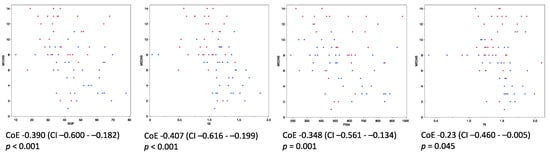 Correlation between the MEDAS score and clinical parameters (BOP, GI, PISA and PI). Scatterplots; data from T0 0 (blue) and T2 (red) for both groups (n = 73). MEDAS = Mediterranean Diet Adherence Screener, BOP = bleeding on probing, GI = gingival index, PISA = periodontal inflammation surface area, PI = plaque index, CoE = correlation estimate, CI = 95% confidence interval.
