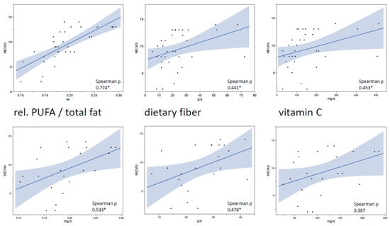 Correlations between the MEDAS score and MedD-associated nutrients. Scatterplots with regression lines and 95% confidence intervals; data from T2 for both groups (FFQ, n = 36; 24dr, n = 23). * p < 0.05, MEDAS = Mediterranean Diet Adherence Screener, PUFA = polyunsaturated fatty acids.