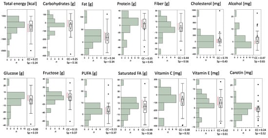 Calculating the concordance coefficient, the 24dr and DEGS-FFQ results showed values between 0.00 and 0.79, most pronounced for CHO (0.79). The additionally calculated nonparametric Spearman ρ displayed values from 0.16–0.65 with values less than 0.20 for CH and GLUC (Figure 5).