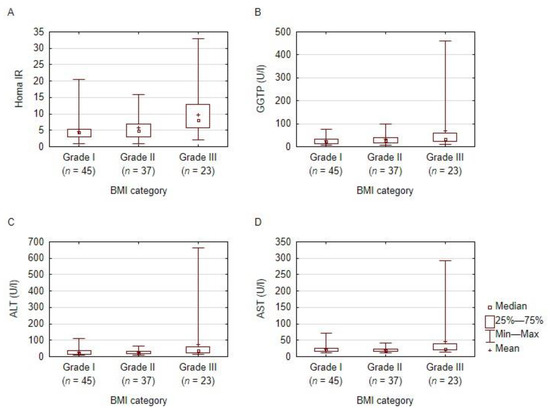 | Parameter | Grade I Obesity n = 45 Me (Q1–Q3) | Grade II Obesity n =37 Me (Q1–Q3) | Grade III Obesity n =23 Me (Q1–Q3) | H | p |