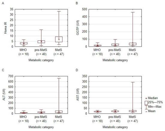 | Parameter | pre-MetS n = 40 Me (Q1–Q3) | MetS n = 47 Me (Q1–Q3) | MHO n = 18 Me (Q1–Q3) | H | p |