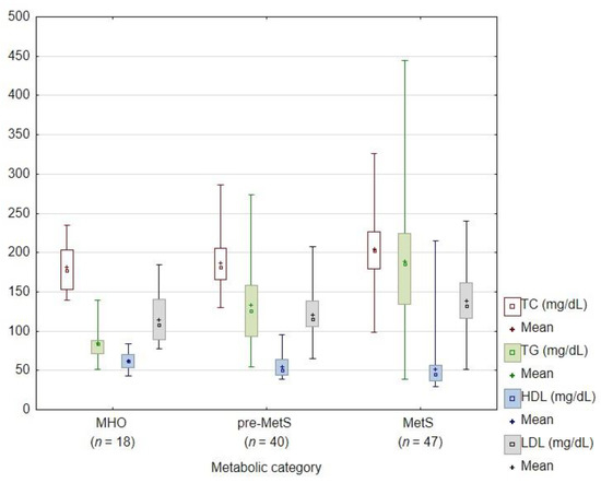 | TG (mg/dL) | 113.5 (83.5–166) | 146 (114–189) | 160 (103–209) | 3.47 | 0.18 |