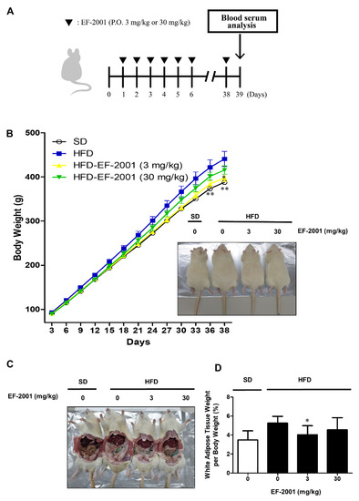 Effects of EF-2001 oral administration on HFD-induced accumulation of white adipose tissue and body weights of obese rats. (A) Workflow of experimental procedure in HFD-induced SD rats. Male rats were divided into standard diet (SD) or high fat diet (HFD), and rats were orally administered with refined water, 3 mg/kg EF-2001, or 30 mg/kg EF-2001 in water (n = 6 rats/group). Gavage was continued for 6 weeks. (B) Effects of EF-2001 on the weight of SD rats fed by standard diet and HFD for 6 weeks. Body weight was monitored each day. (C) Effects of EF-2001 on the accumulation of adipose tissue of HFD-induced obese rats. To investigate the weight of adipose tissue, the rats were sacrificed, and the abdomen was opened to take pictures. (D) Effects of EF-2001 on the weight of white adipose tissue of HFD-induced obese rats. Data was analyzed with white adipose tissue weight per body weight. Data are represented as the mean ± SEM. (n = 6); * p < 0.05 and ** p < 0.01 vs. control (without EF-2001 in HFD-induced obese rats).