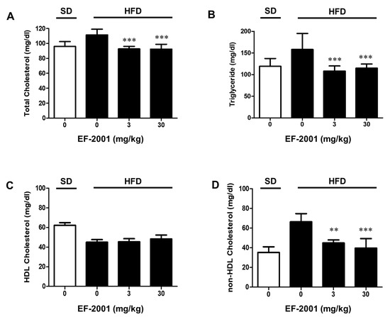 Hyperlipidemia is strongly connected with obesity and cardiovascular disease [31]. We demonstrated that oral administration of EF-2001 benefited lipid metabolism, including cholesterol-lowering. The results showed that EF-2001 significantly lowered plasma TG level at both doses (3 mg/kg and 30 mg/kg EF-2001). In addition, both doses significantly reduced non-HDL cholesterol levels in HFD-induced rats but does not affect HDL (Figure 2). An HFD can increase total cholesterol (such as TG and LDL-cholesterol levels) resulting in an increased risk of atherosclerosis [32]. LDL cholesterol is known to be the primary factor that induces atherosclerotic plaque lesions by contributing to the penetration of oxidized LDL cholesterol into arterial walls. Regulating serum TC and LDL cholesterol level is required to prevent the formation of atherosclerotic plaque lesions [33]. These results show that EF-2001 contributes to the down-regulated control of levels of serum TG, total cholesterol, and non-HDL cholesterol elevated by the induction of HFD.