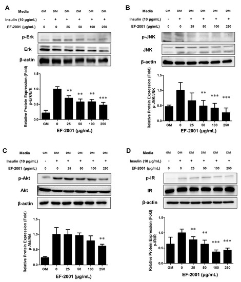 Effects of EF-2001 on insulin receptor pathways in 3T3-L1 adipocytes. 3T3-L1 adipocytes were performed to adipogenesis for 2 days in the absence or presence of various dose of EF-2001. Cells were harvested at the time at which the expression of each insulin signaling protein was induced. Cells were sampled by lysis buffer after insulin treatment for phosphorylated Erk (30 min) (A), phosphorylated JNK (45 min) (B), phosphorylated Akt (45 min) (C), and phosphorylated IR based on phosphorylation detection (15 min) (D). Data are represented as mean ± SEM. (n = 3); ** p < 0.01, and *** p < 0.001 vs. control (without EF-2001 in differentiation medium).