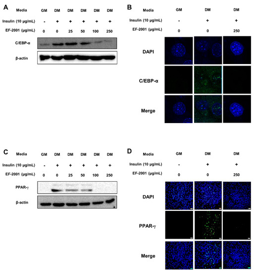 Effects of EF-2001 on the protein expression and nuclear translocation of C/EBP-α and PPAR-γ in 3T3-L1 adipocytes. 3T3-L1 adipocytes were cultured in the absence or presence of EF-2001 at various dose (0, 25, 50, 100, and 250 μg/mL) on MCE and insulin treated after the MCE stage for each medium condition. (A) Effect of EF-2001 on the protein level of CCAAT/enhancer binding protein (C/EBP)-α in MDI-induced 3T3-L1 adipocytes. Lysate for C/EBP-α was sampled on Day 4. The C/EBP-α immunoblot was represented by three independent replicates. (B) Effect of EF-2001 on the nuclear translocation of C/EBP-α in MDI-induced 3T3-L1 adipocytes. C/EBP-α was marked by anti-C/EBP-α primary antibody with Alexa 488 (green), and nuclei were stained with 4′6-diamidino-2-phenylindole (DAPI) (blue). The translocation of C/EBP-α was represented with confocal microscopy at 400× magnification. (C) Effect of EF-2001 on the protein level of peroxisome proliferator-activated receptor (PPAR)-γ in MDI-induced 3T3-L1 adipocytes. Lysate for PPAR-γ was sampled on Day 6. The PPAR-γ immunoblot was represented by three independent replicates. (D) Effect of EF-2001 on the nuclear translocation of PPAR-γ in MDI-induced 3T3-L1 adipocytes. PPAR-γ was marked by anti-PPAR-γ primary antibody with Alexa 488 (green), and nuclei were stained with DAPI (blue). The translocation of PPAR-γ was represented with fluorescence microscopy at 100× magnification.