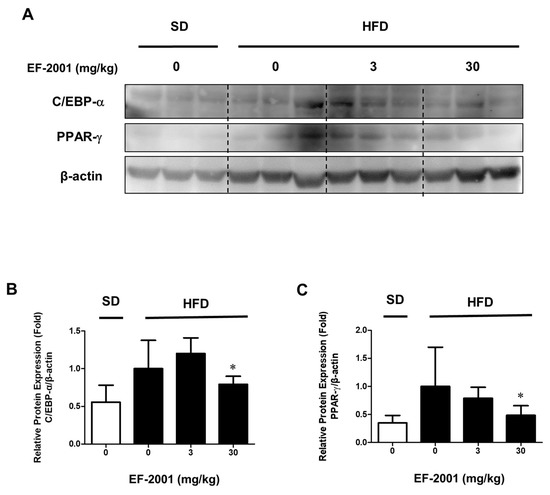 Effects of EF-2001 on immunoblot for the protein level of C/EBP-α and PPAR-γ in HFD-induced adipose tissues. Male rats were divided into SD or HFD, and rats were orally administered with refined water, 3 mg/kg, or 30 mg/kg EF-2001 for 6 weeks (n = 6 rats/group). White adipose tissues containing epididymal fat were collected and separated into lipid and protein. C/EBP-α and PPAR-γ were detected by immunoblotting. (A) The protein levels of C/EBP-α and PPAR-γ were standardized depending on the amount of β-actin. The relative protein expression levels of C/EBP-α (B) and PPAR-γ (C) are shown in the graphs. Data are represented as the mean ± SEM. (n = 6); * p < 0.05 vs. control (without EF-2001 in HFD-induced obese rats).