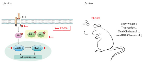 In this study, we identified the effects and mechanisms of EF-2001 in the adipogenesis process and obesity. EF-2001 showed regulating effects on HFD-induced obesity, and decreased the amounts of total cholesterol, triglycerides, and non-HDL in HFD-induced obese rats. EF-2001 induced down-regulation in phosphorylation of downstream signals such as Akt, Erk, and JNK through insulin receptor signaling pathways. Furthermore, oral administration of EF-2001 significantly prevented HFD-induced obesity in rats and reduced protein expression levels of C/EBP-α and PPAR-γ in adipose tissue (Figure 8). Based on our results, the insulin signaling pathway is a potential target of EF-2001 in the adipogenesis process.